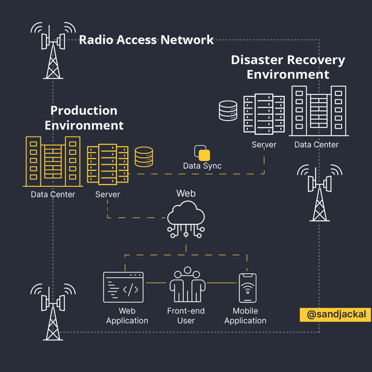 For example, a network diagram can show how a disaster recovery environment mirrors the production by using server icons that are symmetrical with each other. A Wide Area Network can be shown connecting different sites. Or a small cell connects with different Mobile Network Operators and amplifies the wifi connection in a particular site with a dead zone.